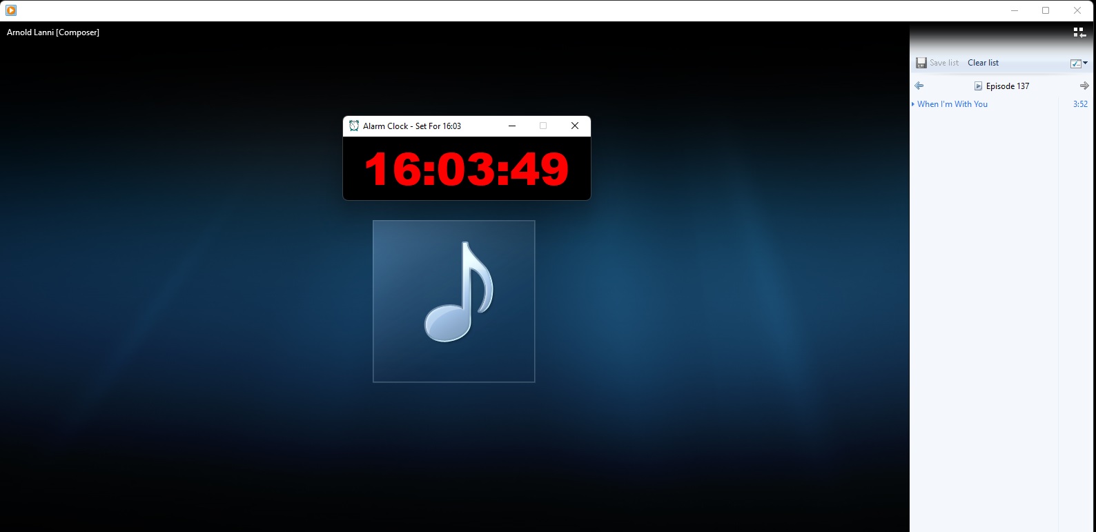 The alarm clock, when it goes off, randomly selects a playlist to play. Below shows a selected playlist playing music.