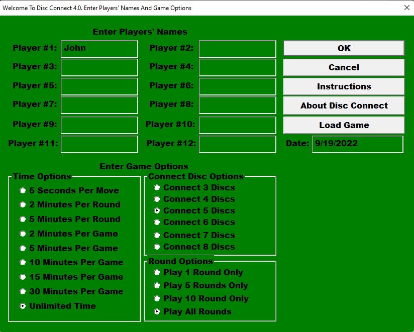 Disc Connect, written by John Sowell, is a board game desktop GUI application, where the player has a supply of discs that he connects by color on an 8x8 board, scoring points for each connection of 3 to 8 discs of the same color in a row, depending on chosen skill level parameters.